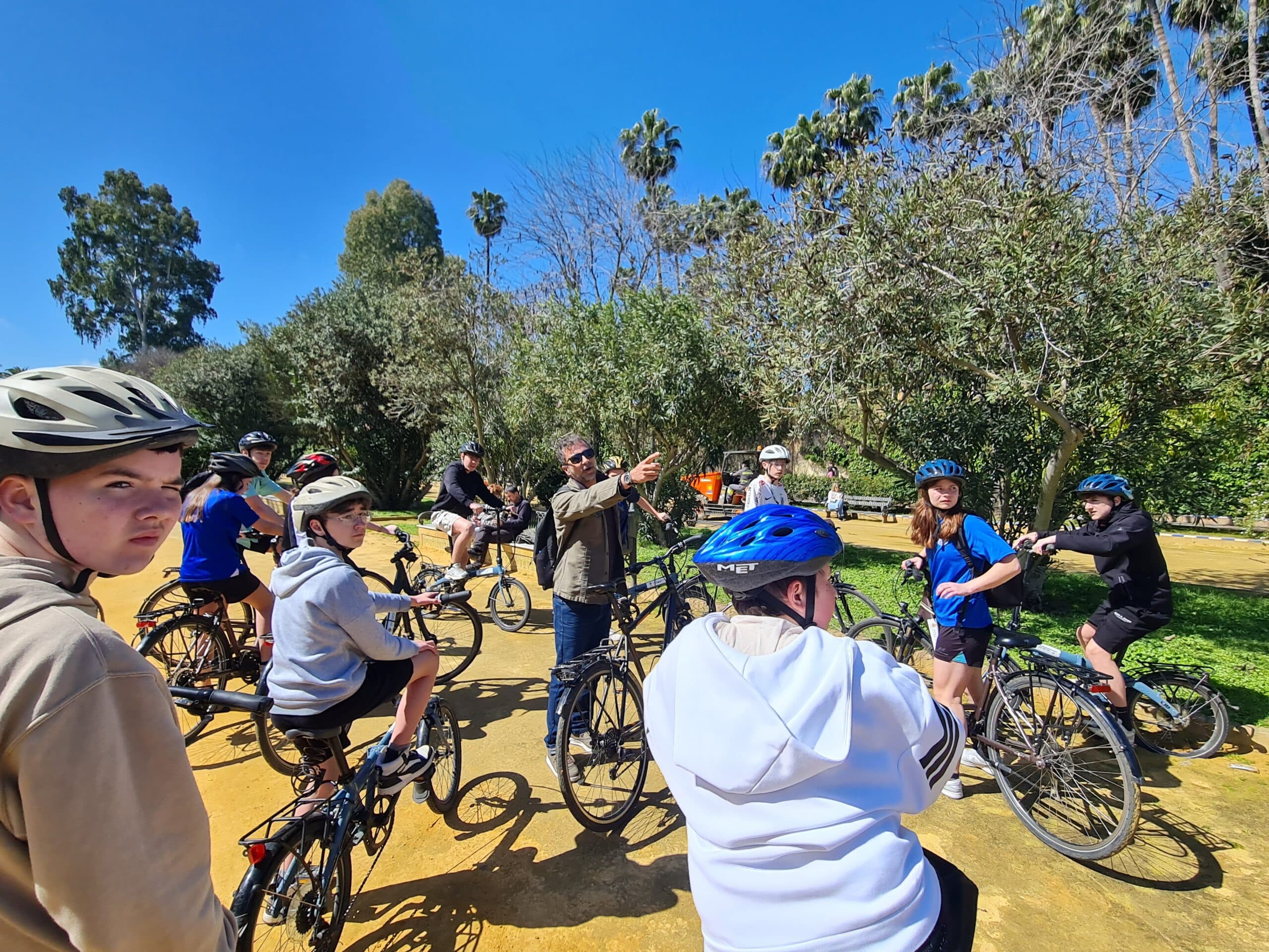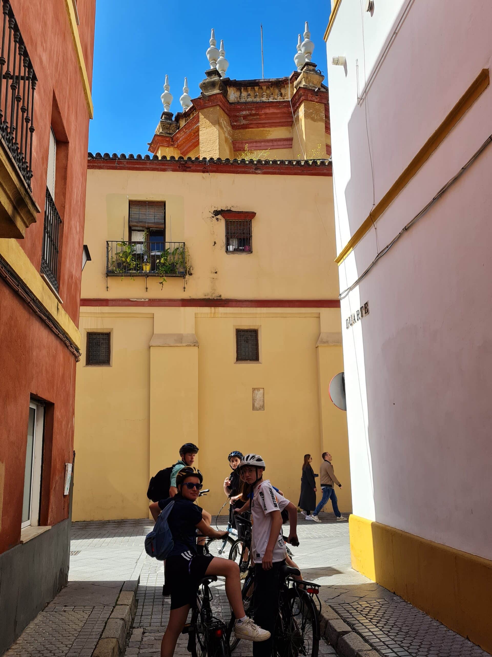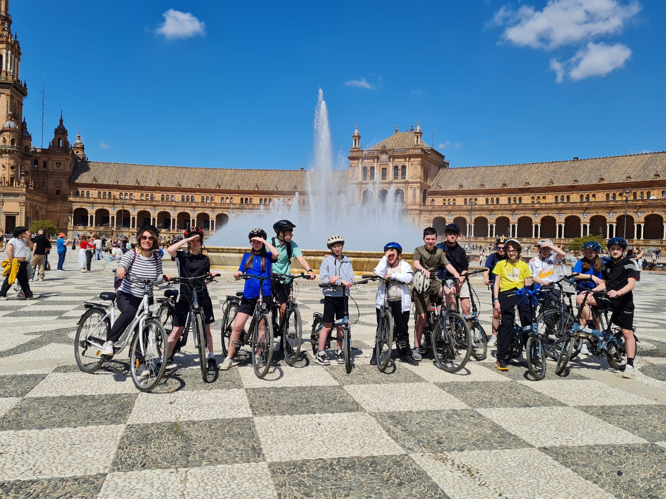 – Balade à vélo avec des guides amusants pendant plus de 2h , on va plus loin et plus vite. On a parcouru le Parc de María LOUISA, admiré la PLAZA de España, magnifique place en demi-cercle avec ses céramiques et ses bancs accueillants.